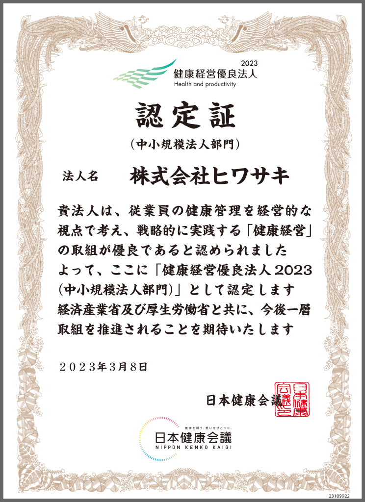 株式会社ヒワサキは、2023年3月8日に経済産業省と日本健康会議が共同で選出する「健康経営優良法人2023」(中小規模法人部門)に認定されました。