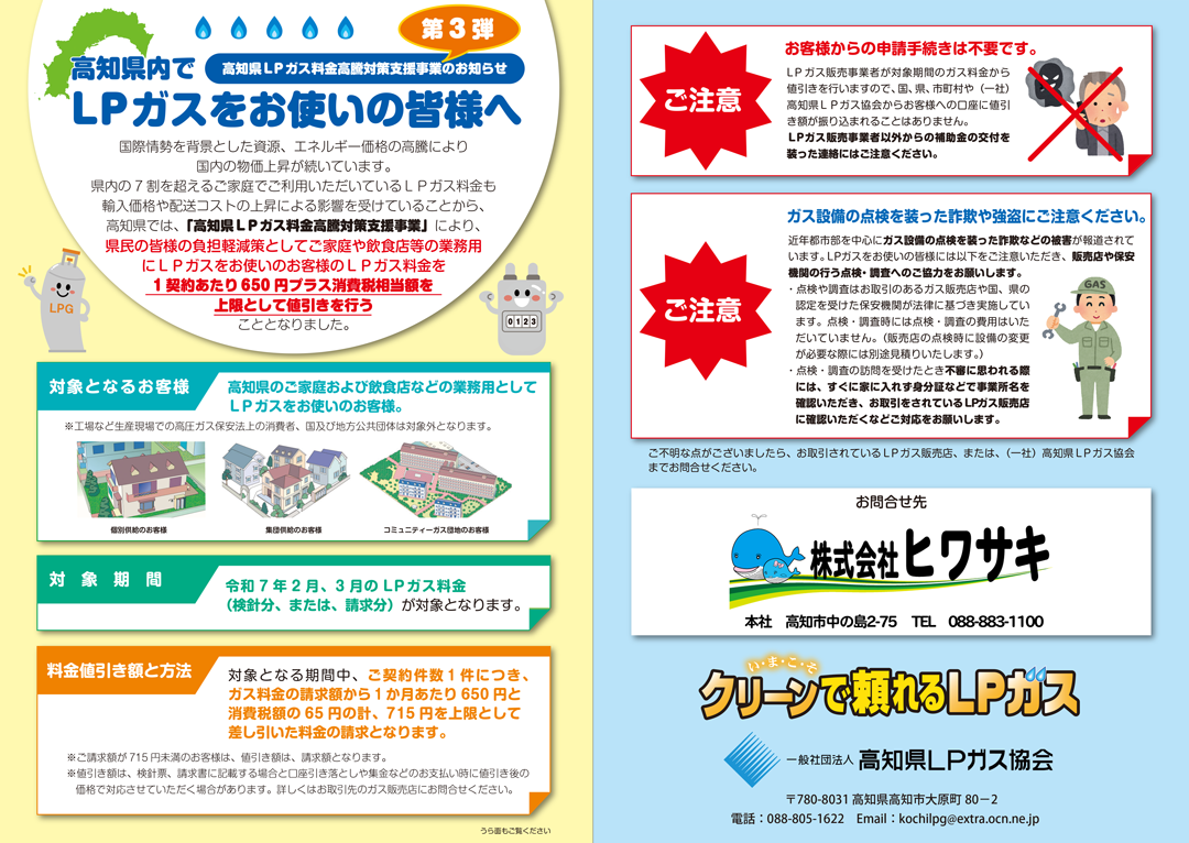 株式会社ヒワサキでは、高知県が実施する「高知県LPガス料金高騰対策支援事業」により、弊社のガスをお使いのお客様の2025年2月、3月分のLPガス料金をご契約件数1件につき、1ヶ月あたり715円(税込)を上限として値引きいたします。
